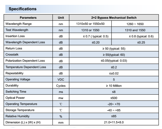 Current Location:Home >> Products >> Micro Optics Components >> 2X2 Bypass Mechanical Optical Switch