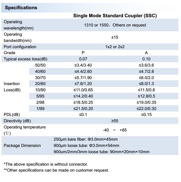 The single mode standard coupler (SSC) features low excess loss, high stability and reliability. It is widely used for optical fiber communication systems and CATV systems.