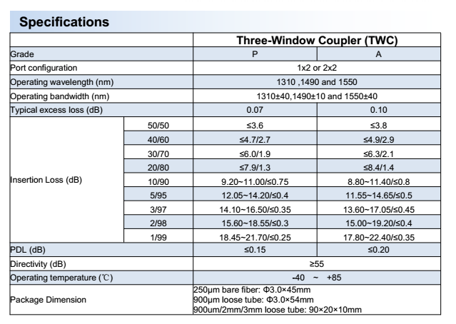 TWC is Built by asymmetric coupling technique, TWC operating bandwidth is expanding to 1310nm, 1490nm and 1550nm three communication windows. The TWC coupler has the same coupling ratio on 1310, 1490 and 1550nm communication windows, with low excess loss and low PDL. TWC is widely used for communication systems, CATV, FTTH, where multiple optical signals pass through single fiber.