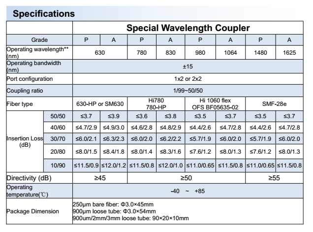 Besides 1310nm and 1550nm fiber couplers, PHX manufactures special couplers with work at wavelengths of 473nm, 532nm, 655nm, 850nm, 980nm,1064nm, 1625nm etc. These couplers use special single mode fibers.