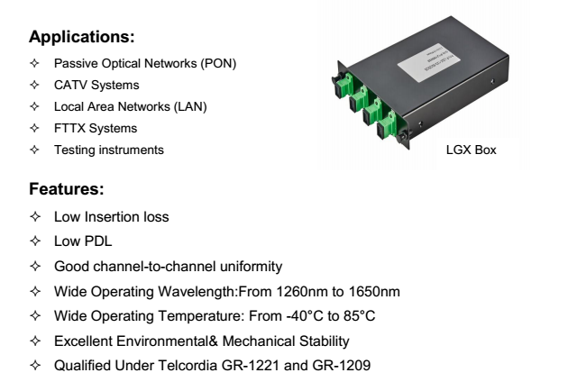 1xN 和 2xN整个系列的光分路器,并可根据客人具体要求定制产品。
