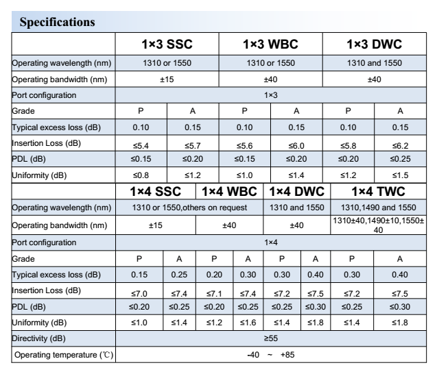 1X3,1X4一次性拉锥耦合器具有尺寸小,低损耗,高可靠性。 这些耦合器可以用在光模块,光传感器和测试系统里!