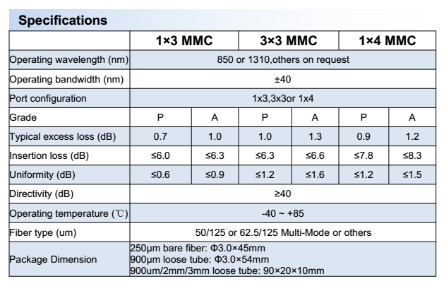 1x3,3x3,1x4一次性拉锥多模耦合器是一款尺寸小,低损耗,高可靠性的产品。这款产品可以用在光模块,光传感和光纤测试系统里!